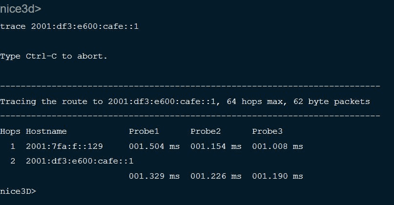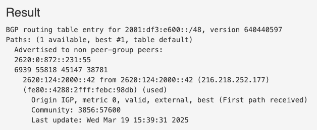 show ip bgp ipv6 unicast 2001:df3:e600:cafe::1