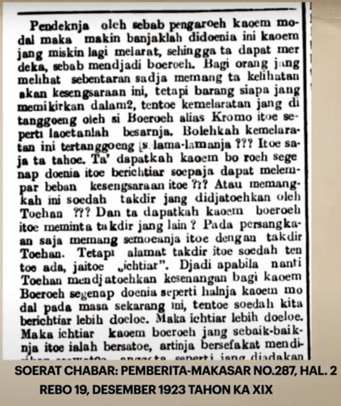 …………. Pendeknja oleh sebab pengaroeh kaocem modal maka makin banjaklah didoenia ini kaoem jang miskin lagi melarat, sehingga ta dapat merdeka, sebab mendjadi boeroeh. Bagi orang jang melihat sebentaran sadja memang ta kelihatan akan kesengsaraan ini, tetapi barang siapa jang memikirkan dalam2, tentoe kemelaratan jang di tanggoeng oleh si Boeroch alias Kromo itoe seperti laoetanlah besarnja. Bolehkah kemelaratan ini tertanggoeng s-lama-lamanja ??? Itoe saja ta tahoe. Ta” dapatkah kaoem bo roch segenap doenia itoe berichtiar soepaja dapat melempar beban kesengsaraan itoe ??? Atau memangah ini soedah takdir jang didjatoehkan oleh Toehan ??? Dan ta dapatkah kaoem boeroeh itoe meminta takdir jang lain ? Pada persangkaan saja memang semoeanja itoe dengan takdir Toechan. Tetap! alamat takdir itoe soedah tentoo ada, jaitoe "ichtiar”. Djadi apabila nanti Toehan mendjatochkan kesenangan bagi kaoem Boeroeh segenap doenia seperti halnja kaoem Modal pada masa sekarang ini, tentoe soedah kita berichtiar lebih doeloe. Maka ichtiar lebih doeloe. Maka ichtiar kaoem boeroeh jang sebaik-baiknja itoe ialah bersatoe, .... (Soerat Chabar: Pemberita-Makasar No.287, hal. 2. Rebo 19, Desember 1923 Tahon ka XIX)